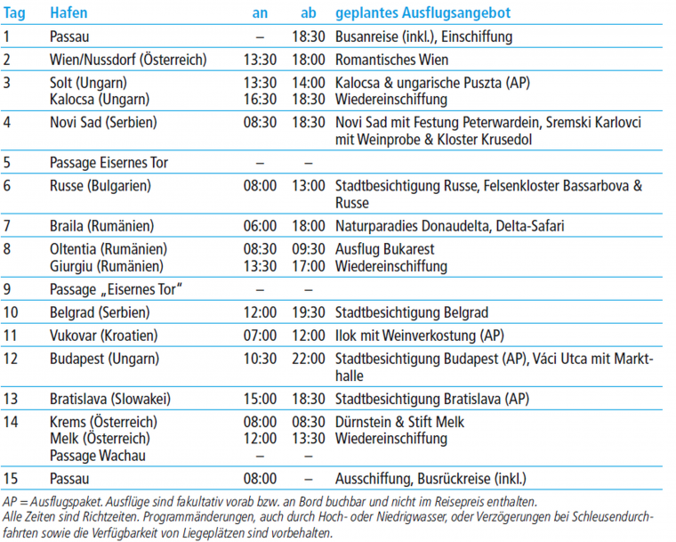 Unvergleichlich sind die Landschaften an der Donau: Schlösser, Burgen, romantische Ortschaften und eine bunte Variation gelebter Kulturen säumen Ihren Weg. Sehenswürdigkeiten liegen dicht beieinander und Kulturschätze reihen sich wie Perlen an einer Schnur. Ein Höhepunkt ist die Fahrt durch die 100 km lange Donauschlucht zwischen den Karpaten und dem Balkangebirge mit dem „Eisernen Tor“.