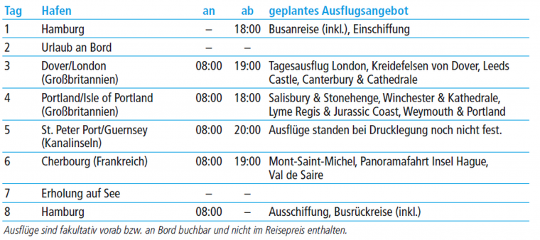 Die imposanten Kreidefelsen von Dover, das Tor Englands, sieht man schon von Weitem strahlen und laden zu traumhaften Ausblicken während eines Spaziergangs entlang der Klippen ein. Guernsey, eine der britischen Kanalinseln, ist ein echtes Juwel im Ärmelkanal: kleine Insel, große Überraschung! Cherbourg in der Normandie steht alldem in nichts nach - duftende Croissants, Baguettes und französischer Käse schmecken hier einfach am Besten!