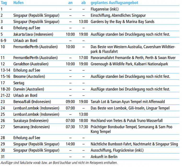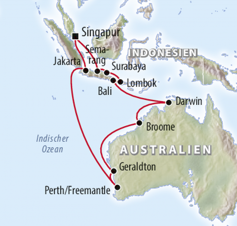 Diese Reise ist voller Kontraste und Farben. Vom futuristischen Glanz Singapurs gleitet das Schiff in die tropische Inselwelt Indonesiens und weiter nach Australien mit seinen weiten Küsten, pulsierenden Städten und einer einzigartigen Tierwelt. Zum Abschluss wird Sie Bali mit seinen exotischen Tempeln, Reisterrassen und dem sanften Licht der untergehenden Sonne verzaubern. Kultur, Natur und grenzenlose Freiheit verbinden sich zu einem unvergesslichen Erlebnis.
