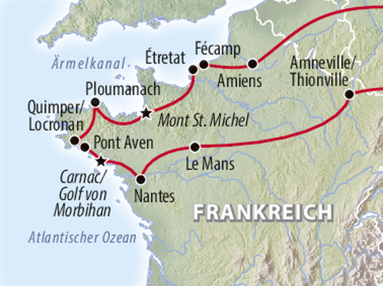 An Felsklippen brechen tosend die Wellen des Atlantiks, Fischerboote tanzen auf dem Wasser und malerische Hafenstädte schmiegen sich in den Schutz tief eingeschnittener Buchten. Allerorts zeugen regionale Spezialitäten vom Reichtum des Meeres, welches das "Land am Meer", wie schon die Gallier die Bretagne nannten, zu bieten hat. Seien Sie gespannt, welche faszinierenden Einblicke die französische Atlantikküste für Sie bereithält!