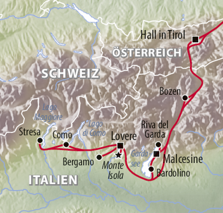 Erleben Sie eine faszinierende Reise, die Sie von den Bergwelten Tirols bis zu Italiens schönsten Bergseen führt. Zwischen historischen Städten und malerischen Uferpromenaden genießen Sie mediterranes Flair, sonniges Klima und Ausblicke auf tiefblaue Seen wie den Gardasee, den Iseosee und den Lago Maggiore. Schifffahrten und eine Weinprobe runden die Tage eindrucksvoll ab.