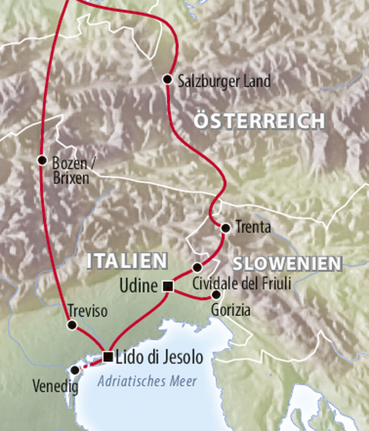 Gondeln statt Autos, Kanäle statt Straßen: Venedig ist eine einzigartige Stadt mit romantischem Charme, prachtvollen Bauten und zahlreichen Kunstschätzen. Im Umland locken faszinierende Laguneninseln und malerische Altstädte – das herrliche Panorama vom Golf von Venedig stets im Blick. Auch die landschaftliche Vielfalt Sloweniens im Nationalpark Triglav und im Weinanbaugebiet rund um Goriška Brda verspricht erlebnisreiche Tage zwischen Alpen und Adria!