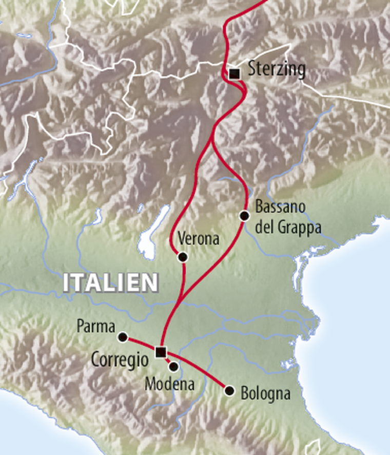 Auf der Fahrt in Richtung Süden lernen Sie das bezaubernde Städtchen Bassano del Grappa kennen, wo Sie das gleichnamige edle Tröpfchen probieren können. Anschließend geht es nach Correggio in Ihr ••••Hotel President, wo Sie die nächsten vier Nächte verbringen. (F, A)