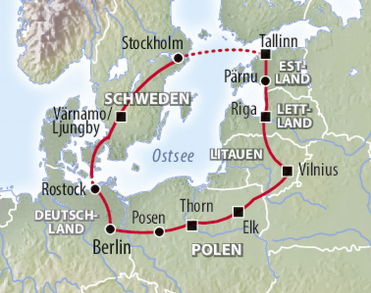 Entdecken Sie auf dieser Reise fünf faszinierende Länder zu beiden Seiten der Ostsee und lernen Sie die Metropolen Litauens, Estlands und Lettlands, aber auch die königliche Hauptstadt Schwedens kennen. Neben der reichen Vergangenheit der Hansezeit begeistern skandinavische Lebensart, Sprachen und Kulturen ebenso wie unberührte Natur mit langgestreckten Küsten und Dünen, tiefblauen Seen, weiten Mooren und Wäldern.