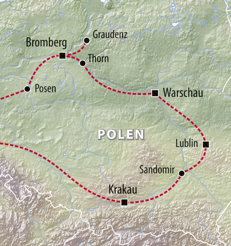 Polens schön herausgeputzte Städte faszinieren mit viel Unentdecktem, vielseitiger Kultur und meisterhafter Baukunst. Neben Klassikern wie Warschau und Krakau erwarten Sie auf dieser inspirierenden Rundreise auch Geheimtipps wie Bromberg und Thorn in der geschichtsreichen Region Kujawien-Pommern oder das pittoreske Sandomir. Erleben Sie einzigartige Schlösser, atemberaubende Landschaften und die herzliche polnische Gastfreundschaft!