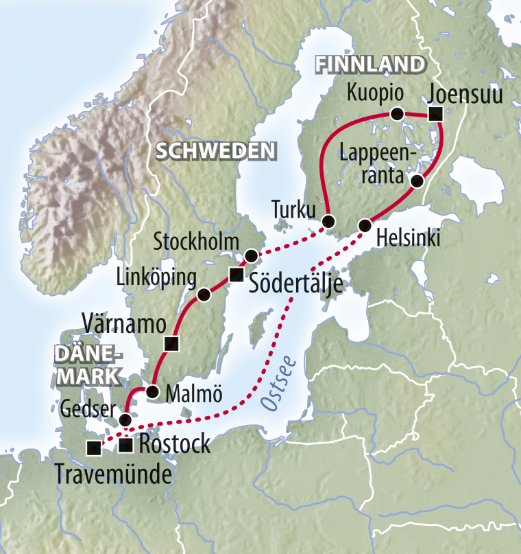 Auf Ihrer Rundreise wohnen Sie meist in zentral gelegenen und gut ausgestatteten Mittelklassehotels in Värnamo (1x), Södertälje (1x), Kuopio (1x), Joensuu (2x) und Helsinki (1x). Alle Zimmer bieten Bad oder Du/WC, TV und Telefon. Auf den Fährüberfahrten beziehen Sie Innenkabinen mit Stockbetten und Du/WC.