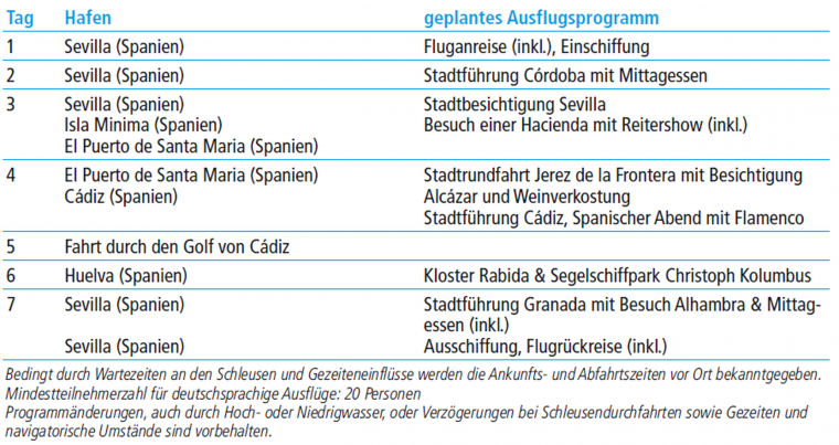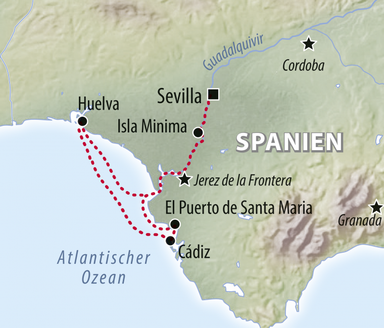 Um Amerika zu entdecken, segelte einst Kolumbus von Sevilla aus den Guadalquivir entlang – vorbei an riesigen Olivenhainen, wilden Sierren und weltberühmten Weinlagen. An den Ufern ist das Land so fruchtbar wie nirgends sonst in Andalusien. Eine Flusskreuzfahrt auf dem Guadalquivir, entlang der „Küste des Lichts“, und nicht zuletzt auf den Wogen des Atlantiks, offenbart das sinnliche Lebensgefühl Andalusiens.