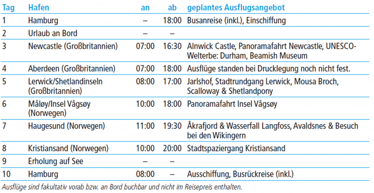 Freuen Sie sich auf eine außergewöhnliche Reise entlang atemberaubender Landschaften und kultureller Highlights. Newcastle, das Tor zum britischen Norden, präsentiert sich Ihnen ebenso stolz wie die zahlreichen schottischen Burgen, die legendenvoll in den anmutenden Highlands liegen. Kontrastreich erwartet Sie dagegen das Naturwunder Norwegen mit einer typischen nordischen Gelassenheit. Diese Kreuzfahrt ist voller Kontraste und einzigartiger Eindrücke!
