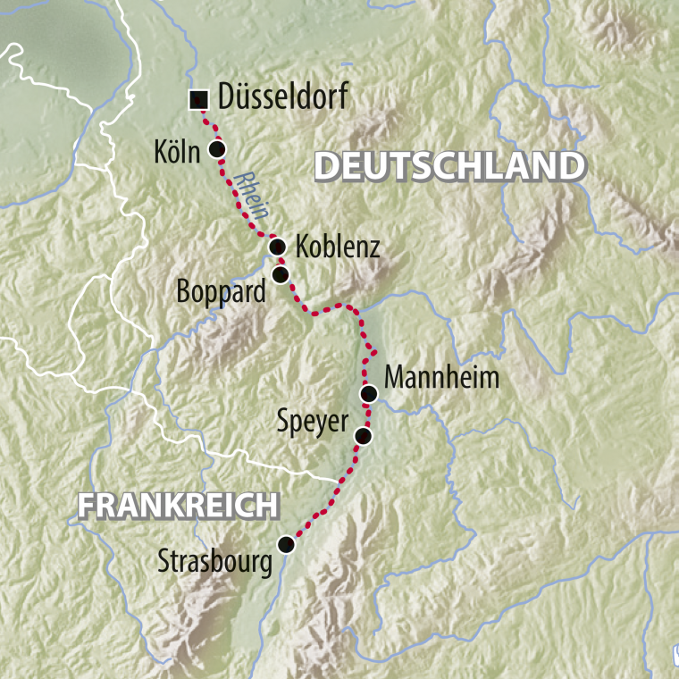 Malerische Uferlandschaften, historische Städte und beeindruckende Schlösser, die stolz auf ihren Hügeln thronen und Geschichten vergangener Zeiten erzählen – der Rhein bietet so viel mehr! Zwischen bunten Fachwerkhäusern und köstlichsten Weinen wartet mit dem Elsass eine atemberaubende Region auf Sie. Mittendrin, zwischen französischem Savoir-Vivre und elsässischer Gemütlichkeit, wartet Strasbourg – ein Muss auf dieser Reise!