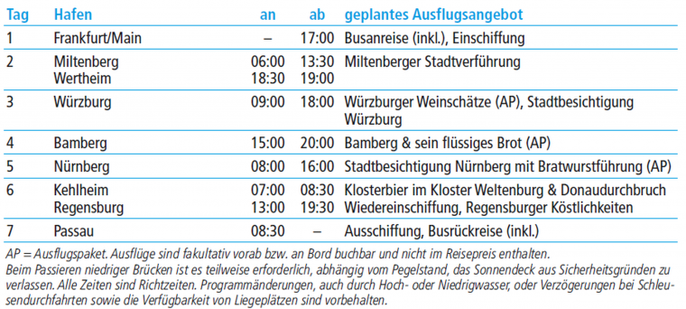 Am Ufer von Donau und Main finden sich neben lieblichen Landschaften und verträumten Dörfern auch romantische Städte, deren kulinarischer Ruf ihnen über die deutsche Grenze hinweg vorauseilt. Würzburgs Weinschätze, Bambergs flüssiges Brot und die berühmten Nürnberger Bratwürstchen sind nur ein kleiner Teil der köstlichen Gaumenfreuden, die Sie auf dieser Kreuzfahrt erleben. Kommen Sie mit auf eine Reise ganz nach Ihrem "Geschmack"!