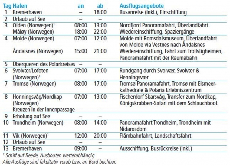 Diese Kreuzfahrt zum Nordkap ist eine Reise in die stille, geheimnisvolle Welt des arktischen Winters. Die Tage sind kurz, die Nächte lang – perfekte Bedingungen, um eines der schönsten Naturphänomene der Erde zu erleben: das Polarlicht. Wenn das Schiff sich seinen Weg durch die kühlen Gewässer des Nordens bahnt, beginnt ein Abenteuer, das Herz und Sinne gleichermaßen berührt. Ob Sie das Polarlicht wohl finden?