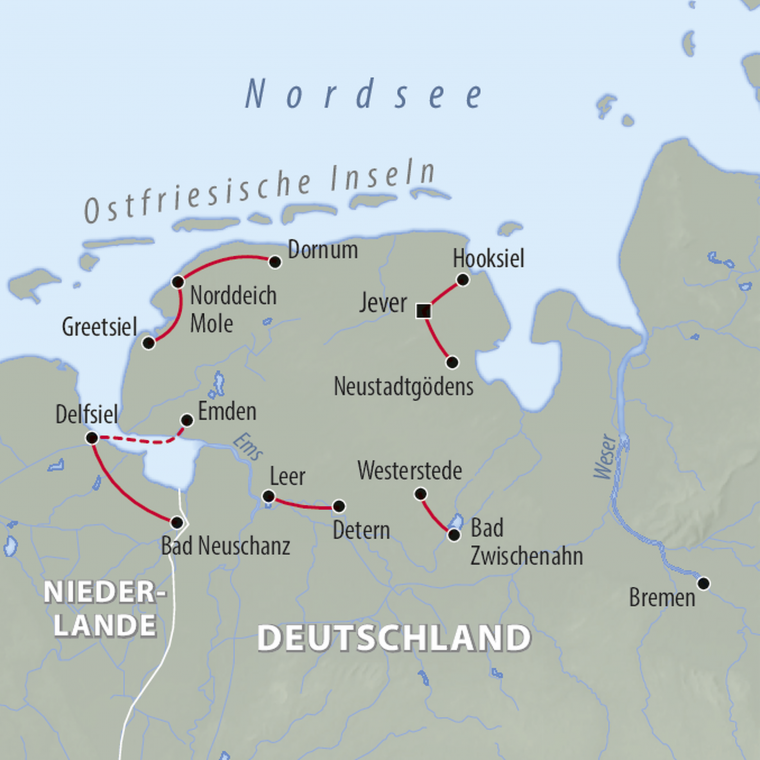 Nach dem Frühstück bringt Sie der Bus in die Niederlande nach Bad Neuschanz. Von hier aus starten Sie Ihre heutige Radtour und fahren auf angenehm flachen Wegen etwa 35 Kilometer bis nach Delfsiel. Danach setzen Sie mit der Fähre nach Emden über, wo Zeit bleibt, die Hafenstadt in Ruhe auf eigene Faust zu entdecken – sei es bei einem Bummel durch die Innenstadt oder beim Verweilen an der Uferpromenade. Das Abendessen gestalten Sie heute ganz individuell nach Ihren Wünschen. (F)