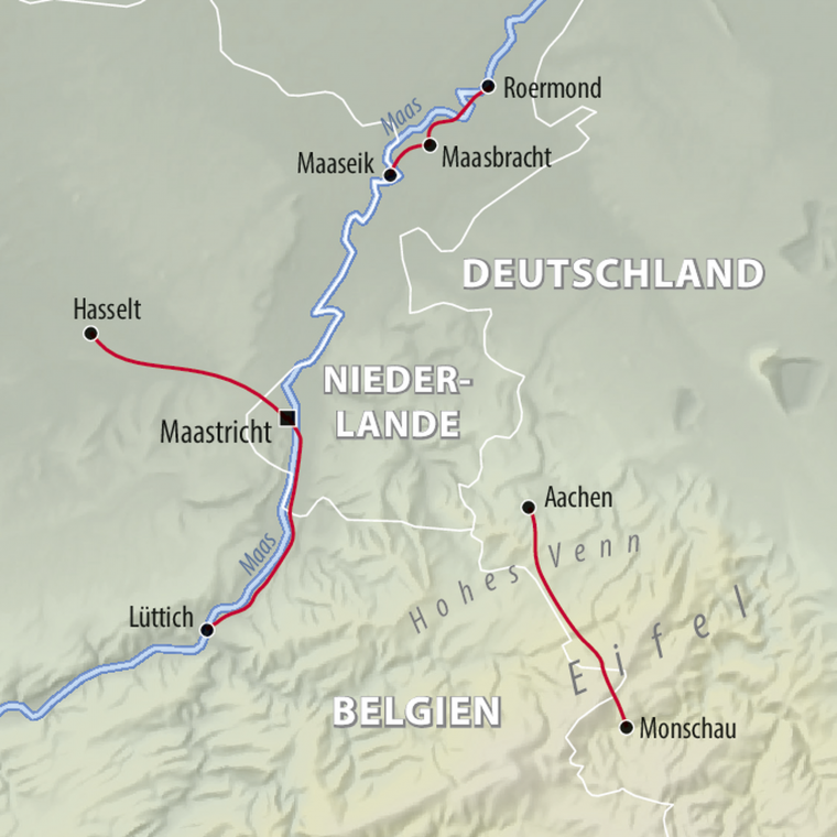 Die Radtour startet in Roermond, bekannt für die idyllische Lage an der Maas. Von dort führt der Weg nach Maasbracht und Stevensweert. Die Route folgt der Maas weiter nach Maaseik und Aldeneik, ein kleiner Ort mit romanischer Kirche. Rückfahrt mit Bus zum Hotel, wo Sie zum Abendessen erwartet werden. (F)