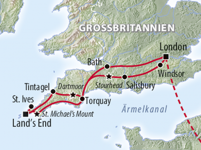 Entdecken Sie die eindrucksvolle Landschaft Cornwalls mit verträumten Seebädern, idyllischen Fischerdörfern, mythenreichen Schauplätzen und sanften grünen Hügeln. Ihr Hotel an der spektakulären Küste von Land’s End ist ein idealer Ausgangspunkt für die Erkundung des südwestlichsten Zipfels Großbritanniens. Das königliche Windsor, die Klosterfestung St. Michael’s Mount und das geschichtsträchtige Salisbury laden dabei ebenfalls zum Staunen ein.