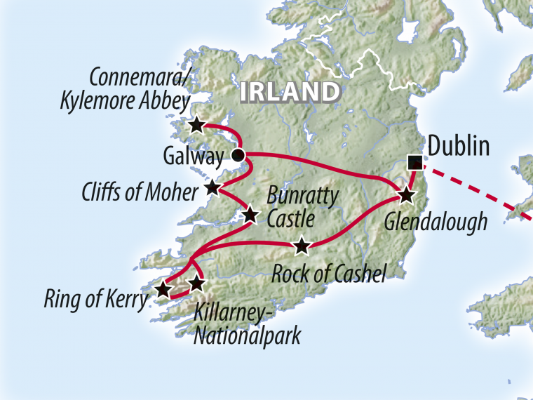 Eine eindrucksvolle Reise nach Irland zeigt Ihnen die schönsten Seiten und Sehenswürdigkeiten der „Grünen Insel“ im Atlantik: die atemberaubenden Felsklippen der Cliffs of Moher, den Ring of Kerry, Dublin, den legendären Rock of Cashel und Spuren keltischer Stämme aus einer längst vergangenen Zeit. Schnell werden Sie sehen, dass sich die Natur Irlands in ihrem schönsten Kleid zeigt und warum diese Bilderbuchlandschaft Anziehungs- und Ruhepol zugleich ist.