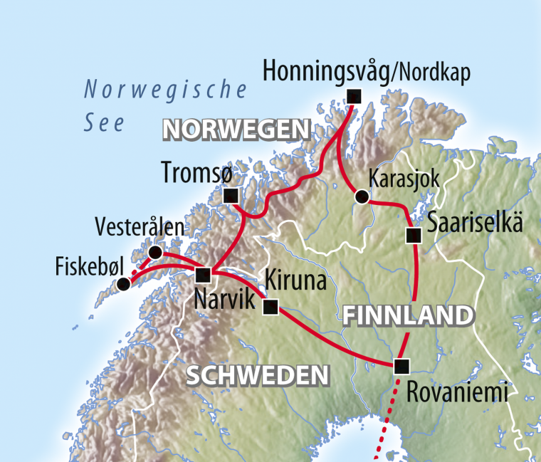 Auf Ihrer Rundreise wohnen Sie in guten landestypischen Mittelklassehotels in Rovaniemi (1x), in Kiruna (1x), in Sortland (2x), in Narvik (1x), in Tromsø (1x), im Raum Honningsvåg (1x) und in Saariselkä (1x). Alle Zimmer sind mit Bad oder Du/WC, zumeist Telefon und TV ausgestattet.