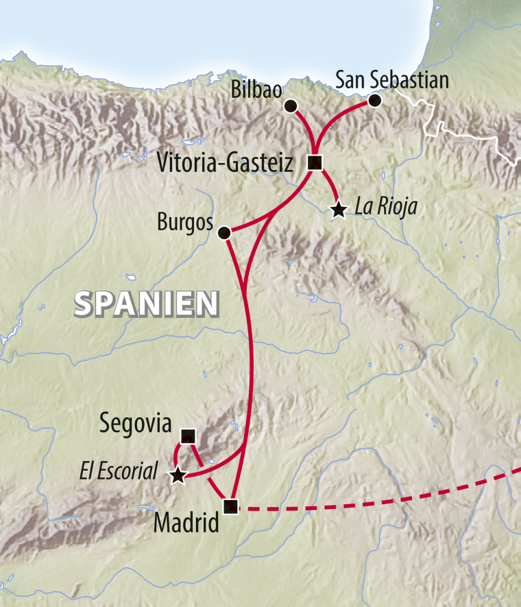 Spanien zeigt sich auf dieser Reise in seiner ganzen Vielfalt: Von der königlichen Eleganz Madrids über die stolze Kathedralstadt Burgos bis zur lebendigen Hafenmetropole Bilbao. Sie probieren Tapas und Pintxos, erleben die baskische Lebensfreude in San Sebastián und entdecken in La Rioja die traditionsreiche Welt des Weins. Eine Reise voller Kultur, Genuss und eindrucksvoller Begegnungen!
