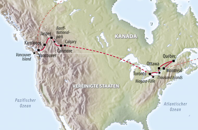 Kanada – das zweitgrößte Land der Erde – begeistert mit Kontrasten: Pulsierende Metropolen voller französischem Flair und unendliche Natur mit türkisfarbenen Seen und majestätischen Berggipfeln. Erleben Sie Montréal, Toronto, die weltbekannten Niagarafälle und Vancouver. Dazwischen erwarten Sie stille Wälder, Gletscher, Nationalparks und Panoramastraßen. Eine Reise von Küste zu Küste – so vielseitig wie Kanada selbst!